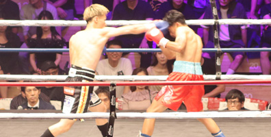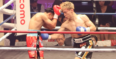 第1R。序盤からタイミング良くジャブを放ち、距離を図るゴウ。