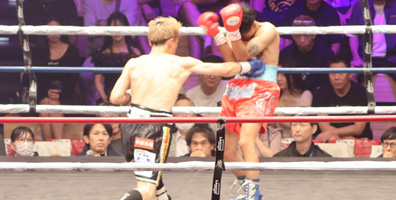 2R終盤、左ボディに続き渾身の右ボディがクリーンヒット。
