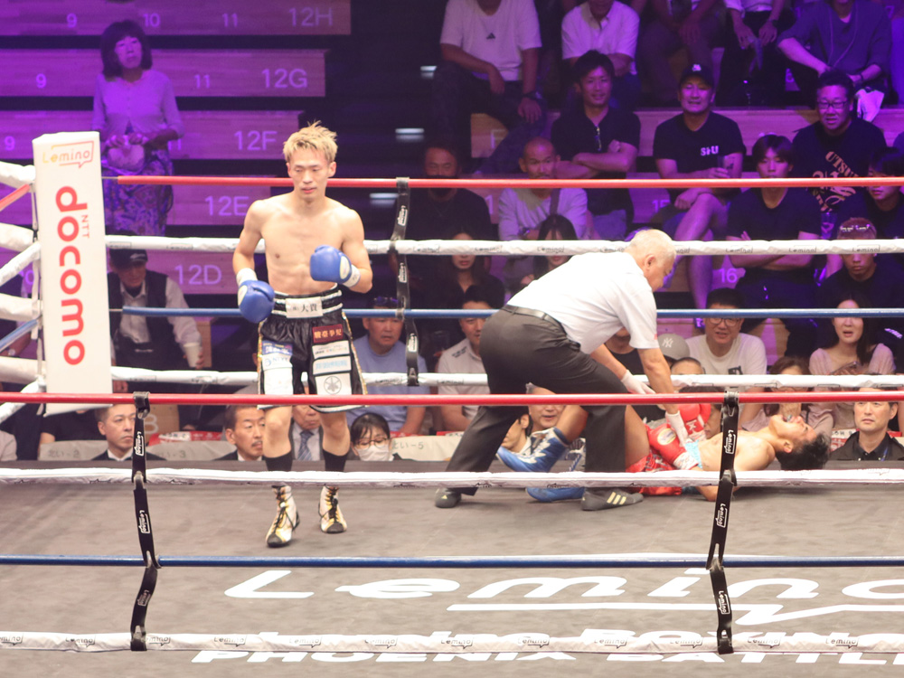 大きくのけぞりダウンする相手選手に、レフェリーが駆け寄る。
