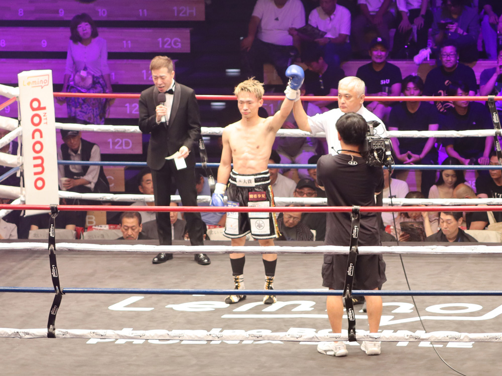 改めて勝ち名乗りを受け、リング中央で拳を高く掲げられる。