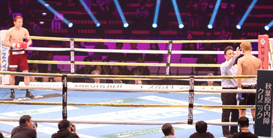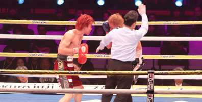 ロープを掴んでダウンを免れる菊池 選手に追撃を掛け、