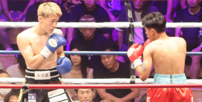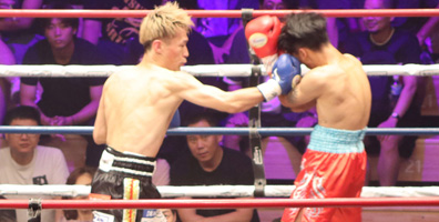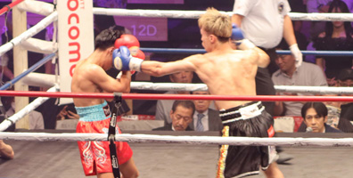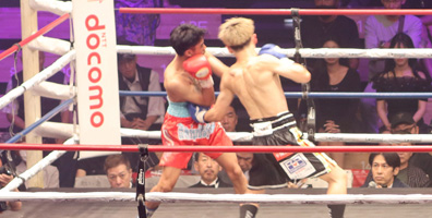 第1R。序盤からタイミング良くジャブを放ち、距離を図るゴウ。