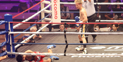 レフェリーストップによる3R TKOで見事勝利した試合の様子を